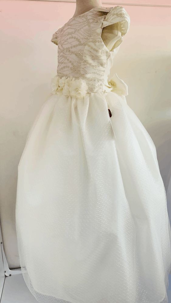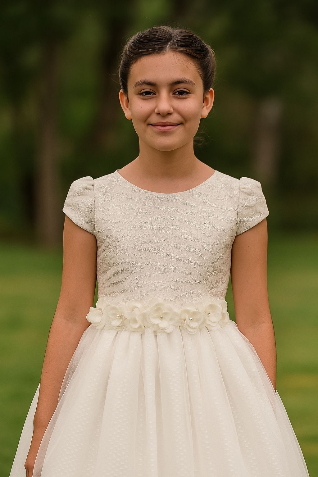 Vestido de Primera Comunión "Macarena" – Elegancia y Brillo para un Día Especial Celebra este momento inolvidable con nuestro vestido de primera comunión Macarena, diseñado para que tu hija brille con luz propia. Confeccionado con mangas cortas cómodas y delicados brillos en la parte superior que capturan la luz con cada movimiento, este vestido combina sofisticación con comodidad. Los detalles florales en la cintura añaden un toque romántico y femenino que realza la belleza natural de la niña. Perfecto para fotografías y momentos especiales, este vestido de comunión garantiza que tu pequeña se sienta segura, hermosa y lista para este día tan importante. Una prenda que trasciende la ceremonia y se convierte en un recuerdo preciado de la infancia.